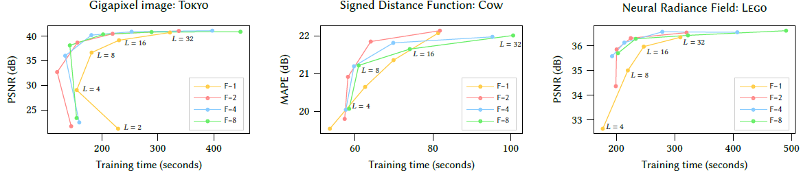 L (number of levels), F(number of feature dimension)도 Quality와 H/W performance의 Trade Off를 가졌으며, 최적의 값으로 선정하였습니다. (T=2^14 ~ 2^24, F=2, L=16)