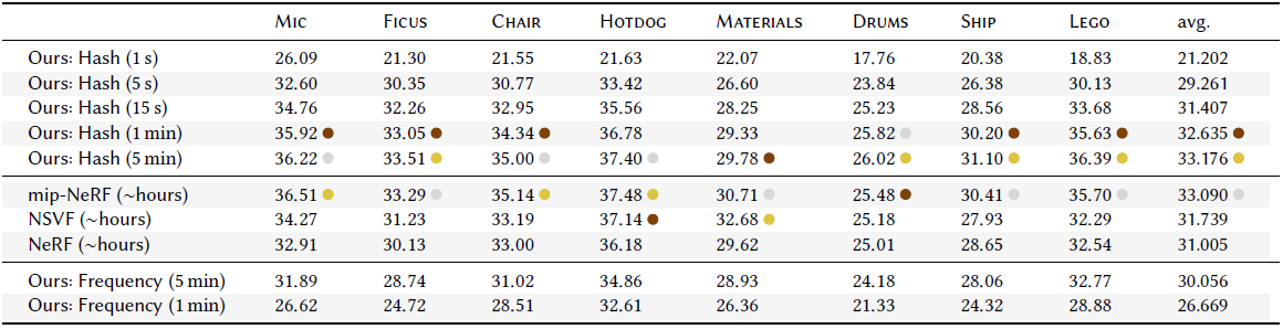 HD해상도에서, RTX 3090에서 syntetic scene, real scene모두에서 수초내에 학습하였고, 60FPS로 랜더링하였습니다. MLP결과를 Caching하는 기법은 사용하지 않았습니다.