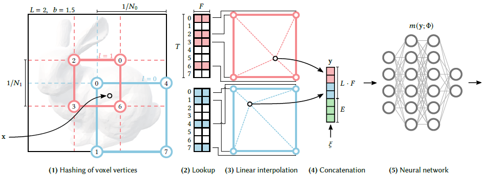 (3,4,5) MLP의 입력으로 들어가는 Feature Vector로 변환하는 과정입니다. 기준 좌표 x와의 떨어진 거리를 Weight로 하여 각 Hash Table의 Value인 Feature Vector(단계(2)에서 사각형 )을 Summation하여 Feature Vector(단계 (4)에서 사각형)를 구합니다. 각 Level마다 계산한 Feature Vector와 추가 auxiliary(보조) 값들(예를 들면, view direction)을 Concatenation하여 MLP의 Feature Vector로 만듧니다. 그리고 MLP를 통과합니다.