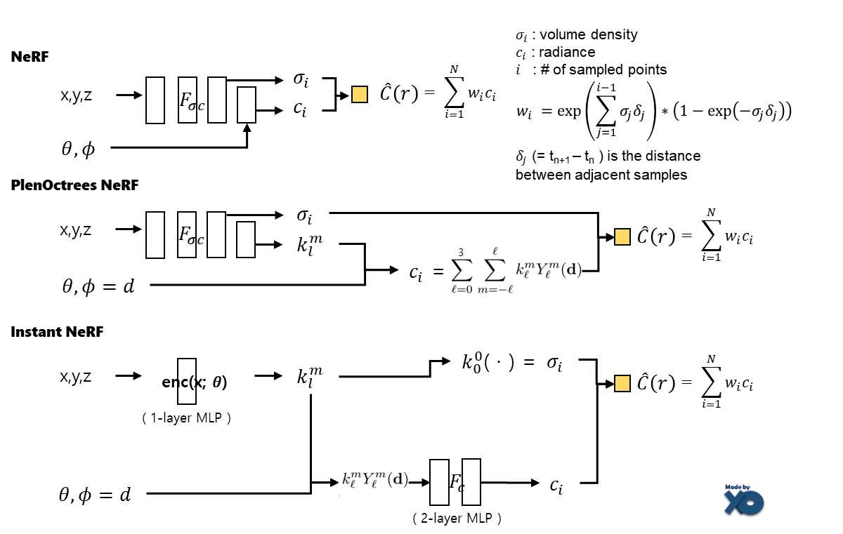 그리고 이전 포스트에서 작성한 NeRF, PlenOctrees NerF모델 구조를 갖고 왔습니다. 이전 논문과 비교하면서Volume Desity와 Radiance로 어떻게 최종 Color값을 구하는지 참고하시면 됩니다.