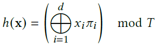 2D Scene이면 4개의 좌표를, 3D Scene이면 8개의 좌표를 얻게 됩니다. 위 예시에서 빨간색 level의 resolution(=N1)는 3이었는데, x가 3만큼 Scaled된 값이 계산 되어지게 됩니다. 이렇게 변형된 좌표들은 아래의 spatial hash function(2003) 수식에 의해 Hash Table을 위한 Hash key값으로 변형됩니다. Hash Table은 Level마다 1개씩 정의 됩니다.