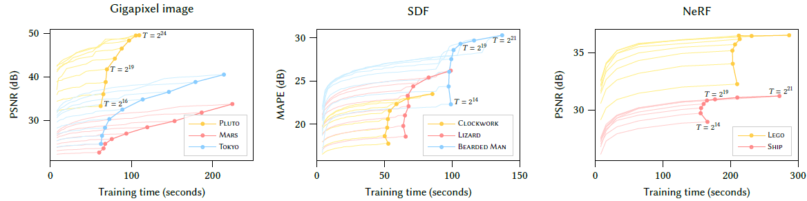 ACORN에서 36.9시간 학습하여 38.59 PSNR을 보였지만, 본 논문에서는 T=2^24로 셋팅하여 2.5분만에 같은 성능을 보이고, 4분후에 41.9 PSNR을 만들어냈습니다. ACORN보다 아주 작은 MLP를 사용하여 10X-100X속도를 만들어냈습니다.