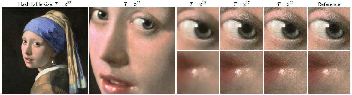 ACORN(Adaptive Coordinate Networks)(2021) 최신 연구에 본 논문이 제안한 Multiresolution Hash Encoding방법론을 적용하여 20,000 x 23,466 해상도의 RGB이미지를 Approximation한 결과입니다. Table Size가 커질수록 Quality가 향상되는 것을 볼 수 있습니다. T=2^12, 2^17, 2^22 일때 학습가능한 parameter는 각각 117K, 2.7M, 47.5M였습니다. T=2^22일 때, 29.8PSNR을 보였습니다.