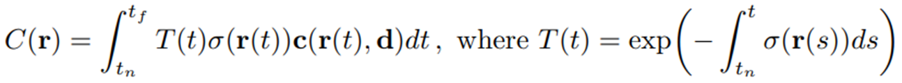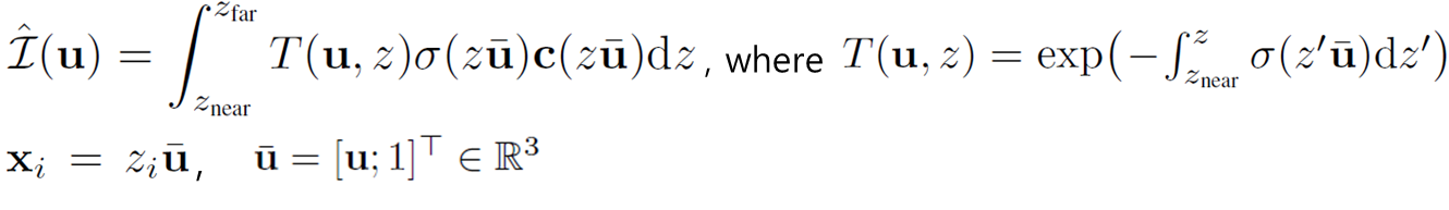 위 식은 original NeRF에서 언급된 Volume Rendering 기반한 pixel에 대한 Color 수식인 아래 수식과 유사한 형태의 수식입니다.