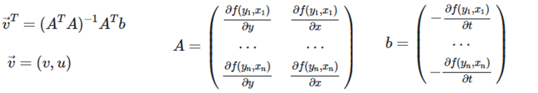 수식에 대해 설명하자면, 각 좌표에서의 변화량 vector v는 해당 좌표 주변의 픽셀에 대해, 픽셀 좌표의 색상 값을 출력하는 f함수를 각 dimension x, y으로 편미분한 행렬 A와 f함수를 시간으로 편미분한 행렬 b로 구성이 됩니다.