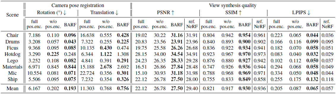 pose 추정에 대해서는 SfM 함수와 동일한지를 보게 되는데, 거의 동일한 수치를 보였습니다. Extrnsic parameter가 주어진 ref NeRF와 비교했을 때 더 좋은 성능을 보였습니다. 당연하게 NeRF의 Positional Encoding을 camera pose가 주어지지 않은 환경에서 사용할 경우 성능이 잘 나오지 않습니다.