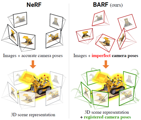 NeRF에서는 Camera Pose가 이미지와 쌍으로 항상 주어져야 하지만 BARF에서는 Camera Pose가 주어지지 않을 경우에도 3D Scene Representation을 할 수 있게 하였습니다.
