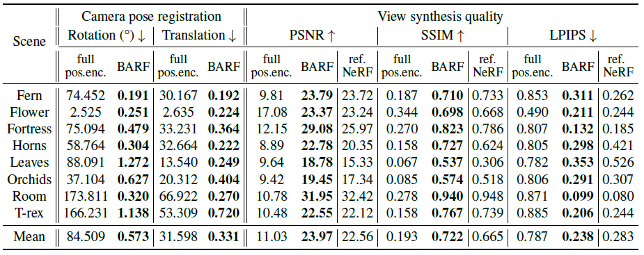 손으로 직접 촬영한 8개의 정면 scene으로 구성된 LLFF 데이터셋에서 (SfM 으로 측정된)pose정보를 제외하여 성능을 측정하였습니다. Camera Extrinsic matrix는 모두 0으로 초기화되어 있고, Camera Intrinsic만 주어지게 됩니다.