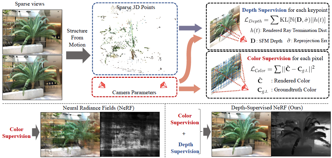 이미지를 입력으로 Structure From Motion(아래 설명)을 사용해서 3D Point Cloud와 Camera Pose인 Camera Paramter를 계산합니다. 3D Point Cloud값을 사용한 Depth Supervision Loss와 기존 NeRF와 동일한 Color Loss를 사용해서 학습합니다.