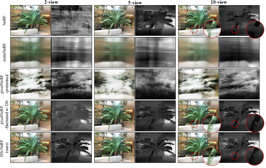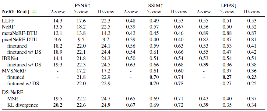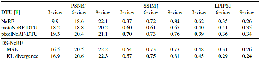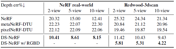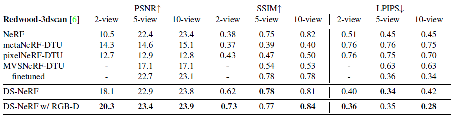 5-view/10-view인 경우 DS-NeRF는 NeRF보다 2~3배 수렴속도가 빠른 것을 확인 할 수 있습니다.
