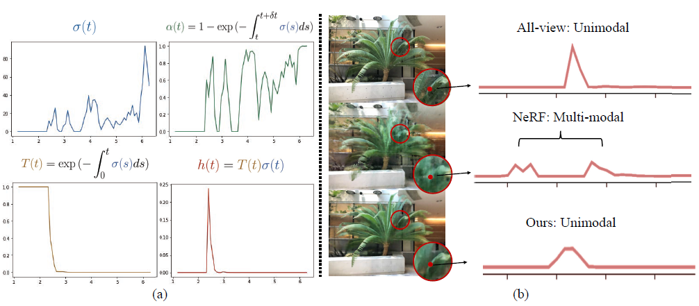 그림(b)의 빨간색 지점으로 Ray를 그려보면, Ray위에 여러object가 있으므로 깊이 t의 voxel에 대한 volume density σ(t)는 (a)1그림와 같이 그려지게 됩니다. Volume Rendering 공식에 의해 깊이 t까지의 투명도를 나타내는 T(t)와 ray의 volume density인 σ(t)를 곱하면 h(t)가 계산되고, (a)4그림과 같이 됩니다. peak가 한개있는 unimodal 형태이며, NeRF에서는 학습 데이터가 충분히 많아질 경우에 나타내는 그래프라고 합니다. 논문저자는 이 h(t)값을 실제 depth의 distribution인 (b)1 분포와 비슷하게 만들고자 하였습니다. NeRF에서는 (b)2그림 처럼 Multi-modal형태의 그래프가 그려지게 됩니다.