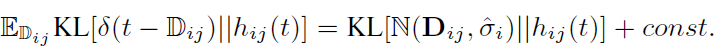 j번째 이미지의 i번째 3D keypoint들과 ray sampling 깊이 t가 변수로 주어집니다. 왼쪽항은 Expection(기대값)이고, 오른쪽항은 계산 할 수 있도록 풀어서 근사한 식입니다. 왼쪽항부터 보면, 'Surface와 가장 근접한 깊이D'와 'sampling한 깊이 t'간의 차이에 대한 distribution δ이 'inference한 h함수'에 대한 distribution과 유사하게 하고자 합니다. 이를 계산이 가능한 Normal distribution함수로 표현하면 오른쪽 수식이 됩니다. 'COLMAP으로 관측한 깊이 D에대한 distribution'과 'inference한 h함수'에 대한 KL Divergence를 최소화하도록 Loss를 설계하였습니다.