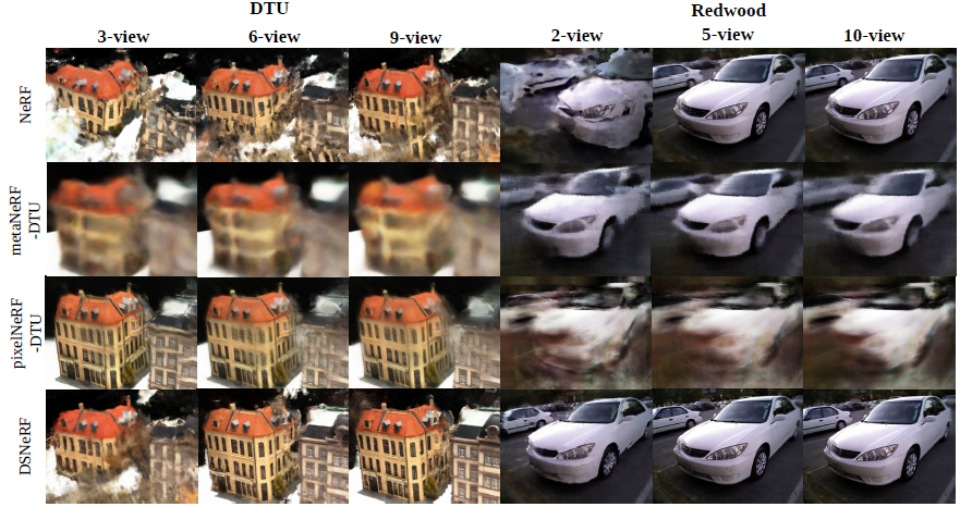 학습 데이터가 3개의 이미지가 주어지는 3-view에서는 PixelNeRF가 더 좋은 성능을 보이고, 6-view / 9-view에서는 DS-NeRF가 더 좋은 성능을 보입니다. PixelNeRF에서는 다른 Scene들로 Feature Extraction부분을 학습하기 때문에 실제적으로 학습데이터가 더 많다고 생각 할 수 있습니다. Prior 학습이 없는 DS-NeRF에서는 3-view에서 충분한 정보가 없기 때문에 성능이 낮게 나오고, 6-view부터 성능이 좋습니다.