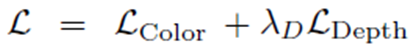 Loss Fuction은 Color Supervision Loss와 Depth Supervision Loss로 이루어져있습니다. λD는 상수입니다.