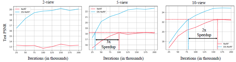 5-view기준으로 NeRF가 Peak 성능을 가지는 100,000 iteration의 성능을 DS-NeRF는 13시간 더 빠르게 도달 하였습니다.