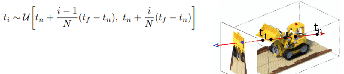 - 1차 Sampling은 Stratified Sampling방식을 사용하였는데, 이는 각 Ray에 대해 중복되지 않도록 균일하게 구간(bin)을 나누고, 각 구간 내에서 랜덤하게 1개의 좌표를 선택하는 방식입니다. tn(n=near) 좌표부터 tf(f=far)까지의 구간을 N개로 균일하게 나누고, i번째 좌표에 대한 U(집합)을 ti로 표현 하였습니다.