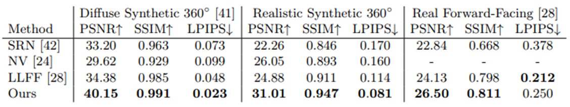 - Realistic Synthetic : NeRF논문에서는 추가로, non-Lambertian Reflectance를 갖는 8개 Object에 대해 800x800이미지를 사용하였고, 각 Object에 대해 100개를 input이미지, 200개를 Test 이미지로 두었습니다.