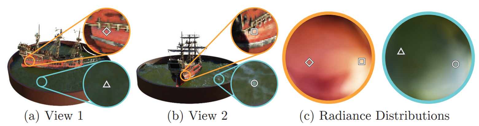 이러한 설계를 통해 아래 그림과 같이, 다른 View Direction에서 같은 지점을 바라 볼때, Radience가 달라지면서, 다른 RGB값을 갖게 합니다.