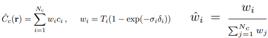 - 그 Radiance와 Density로 2D Pixel의 RGBA값을 아래 수식으로 계산합니다.