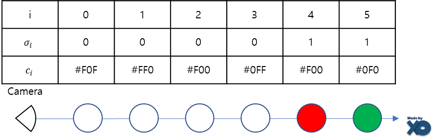 i=5일 때, 𝜎𝑖 는 0보다 크고, Ti는 𝜎4에 의해 크기가 줄어듭니다. 이는 4번째 Voxel에 의해 5번째 Voxel이 가려져, c5 가 C(r)에 적은 영향력을 주도록 수식화 되어 있습니다.