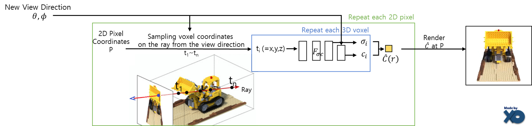 - Inference시, 새로운 카메라 시점(𝜃,𝜙)이 입력으로 주어지면, Train한 모델로 3D Voxel 좌표에서의 RGB𝜎값을 계산한 후, 대응되는 2D Pixel 좌표로 Summation함으로써 색상 값을 Prediction합니다.