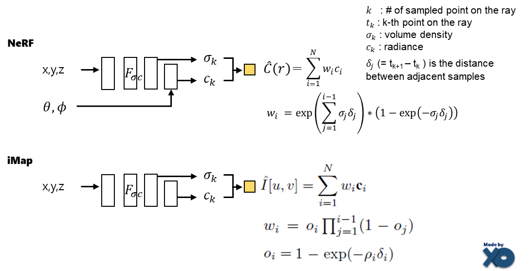 iMap은 NeRF에서 View Direction(θ,Φ) 를 입력으로 받는 것만 사라지고, 다른 부분은 동일합니다. voxel좌표(x,y,z)에 대한 color를 계산하는 공식이 달라보이지만, 자세하게 보면 같은 수식임을 알 수 있습니다. depth에 대해서 NeRF논문에서는 언급안됬지만 소스코드 (NeRF 소스코드 분석 이전 포스트 참조)에 보면 Depth를 계산하는 수식이 있습니다. color대신에 카메라 시점에서 Point가 떨어진 거리 만큼을 di로 쓰고, 이 di값을 ci값 대신 사용해서 Depth를 계산합니다.