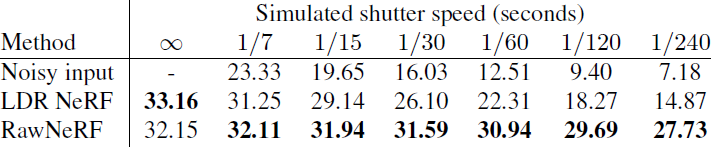 Shutter speed에 따른 퀄리티 실험입니다. shutter speed가 느릴경우 노이즈가 적은 데이터를 얻고, 빠를 경우 노이즈가 아주 많은 것을 볼 수 있습니다. Clean한 이미지를 사용하였을 때 LDR NeRF가 좋은 성능을 보이고, 노이즈가 많아질수록 RawNeRF의 성능이 좋은 것을 볼 수 있습니다.