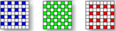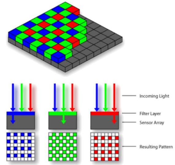 카메라 센서를 좀 더 깊게 보면, 모든 pixel 화소들 각각은 RGB값을 저장하지 않고, 각 화소는 흑백의 밝기만을 감지하고 아래 그림과 같이 센서 위에 칼라 필터가 결합됩니다. (출처 : link1 , link2)