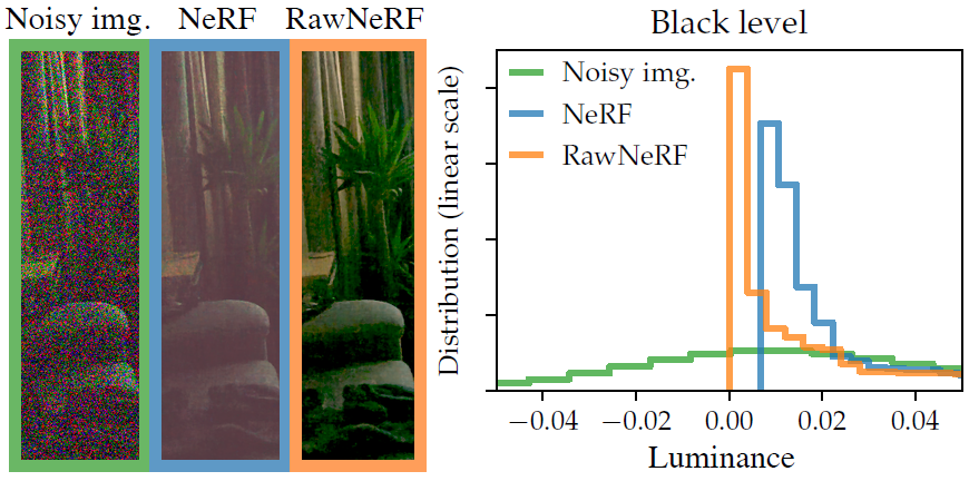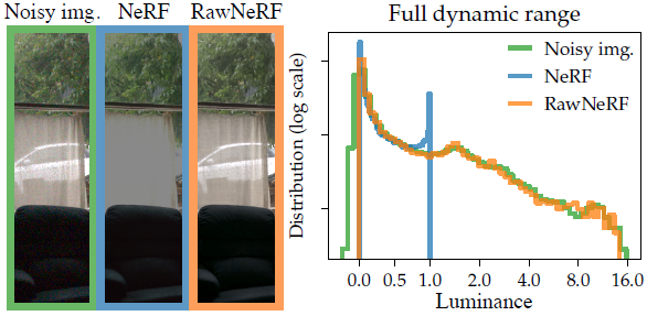 Noisy img를 확대 했을 때 Bayer Color Filter모양이 약간 보이는 것으로 봐서 raw image를 demosaick한 이미지로 보입니다. NeRF는 Postprocessed된 LDR이미지로 학습한 후 랜더링한 결과이고 RawNeRF는 raw image로 학습 후 HDR 랜더링하고 post processing한 결과입니다. Luminance가 1 이상인 경우 표현못하는 것을 볼 수 있습니다.