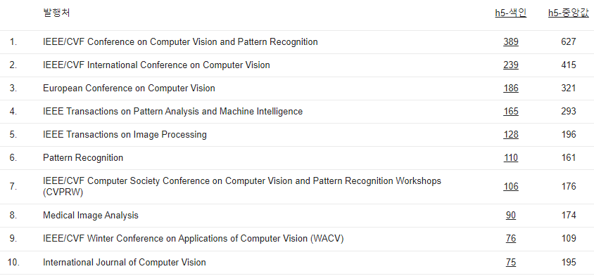 2023년 2월13일 기준으로 CVPR, ICCV, ECCV 이 1,2,3위를 하고 있습니다.