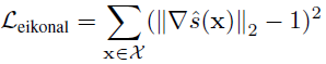 Eikonal Loss는 SDF값인 s로 regularize합니다. x는 균일하게 샘플링된 surface 주변 point set입니다. SDF 최신 연구들이 많이 사용하는 Regularization Loss입니다.
