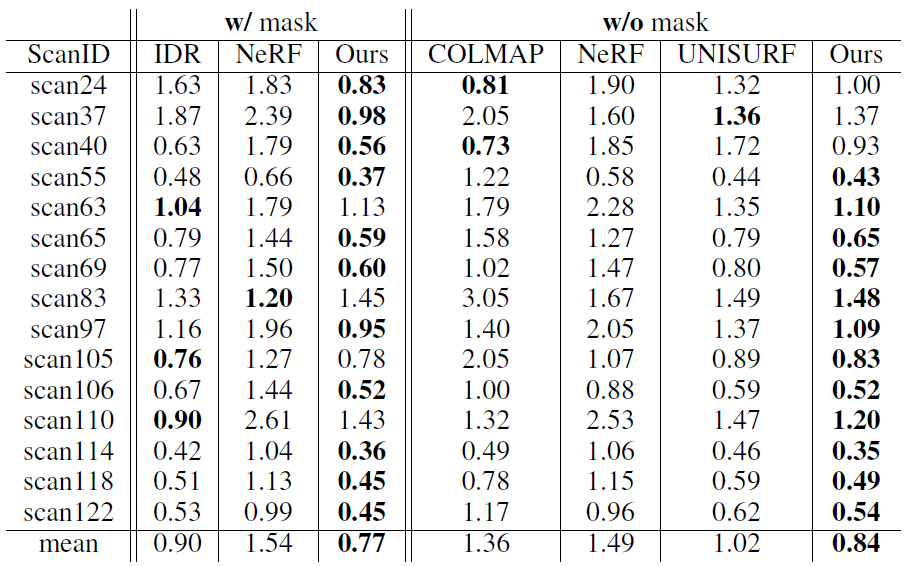 DTU 데이터셋으로 비교한 결과입니다. mask를 사용할 경우 IDR과 NeRF와 비교하였고, mask를 사용하지 않을 경우 COLMAP, NeRF, UNISURF와 비교하였습니다. Chamfer Distance (설명 : link)로 GT와 Prediction간의 거리를 측정하여 평가하였습니다. mask를 무조건 사용해야하는 IDR이 3개의 Scene에서 우수한 결과를 보이지만 NeuS의 성능이 더 좋습니다.