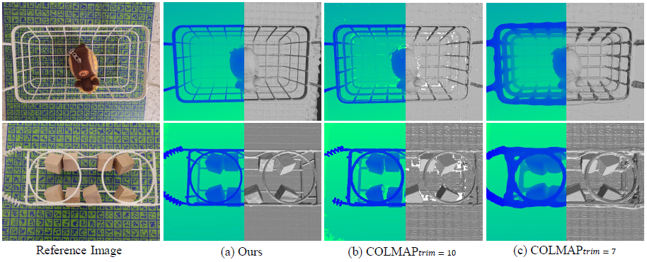아래는 thin한 물체에 대해 32개 입력이미지로 학습한 결과입니다. 평면이 있는데 카메라 calibration(=camera paramter 획득 작업)을 위해 넣었다고 합니다. 아래 그림을 보면 thin 구조와 급격한 depth 변화를 가진 edge에서도 잘 되는 것을 볼 수 있습니다.