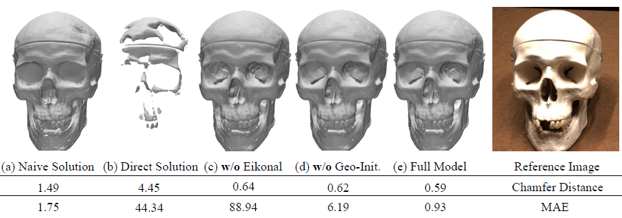 아래 그림은 Mask를 사용하지 않은 결과입니다. NeuS는 다른 연구들보다 fiedlity가 좋습니다. 급격한 depth변화에도 강인한 것을 볼 수 있습니다.
