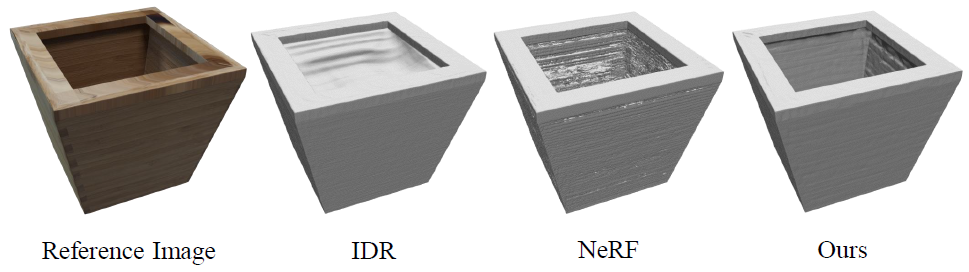 IDR에서는 급격한 depth변화가 있는 복잡한 구조 내 surface위의 single 3D point들에 대해 back propagation하기 때문에 local minimum 문제가 발생했습니다. 논문 저자는 NeRF의 경우 ray위의 sampling된 모든 points들이 back propagation 가능기 때문에 급격한 depth변화에도 강인 할 수 있다고 생각했습니다.
