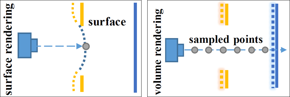 아래 그림을 먼저 보겠습니다. 진한 선이 surface에 대한 GT이고, 점선이 Prediction값입니다. 왼쪽은 Neural Surface Reconstruction 최신 연구인 IDR(2020년)을 사용할 경우이고, 오른쪽은 Neural Volume Rendering인 NeRF를 사용 했을 경우를 나타냅니다..