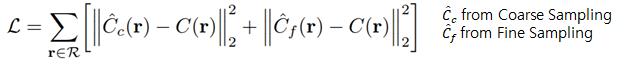 NeRF는 fine sampling과 coarse sampling을 구분해서 Image Plane에서 보여지는 Color값을 계산하고, GT와의 차이를 L2 Loss를 사용했습니다.