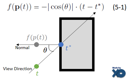 (5-1)은 SDF의 특성상 ray위에 있는 surface위의 t*와 샘플링된 t간의 거리를 구하는 것이 아니라, 샘플링된 t의 Normal Vector값을 사용해야 하기 때문에 만들어진 수식입니다. 이해를 위해 그림을 그려봤습니다.