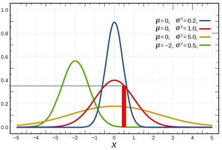 Likelihood값은 위 수식에서 x=0.5 , μ=0 , σ=1.0 를 대입하면 됩니다. 아래 확률값을 진한 빨간색으로 표시해두었습니다. 아래 pdf에서 y값이 Likelihood입니다.