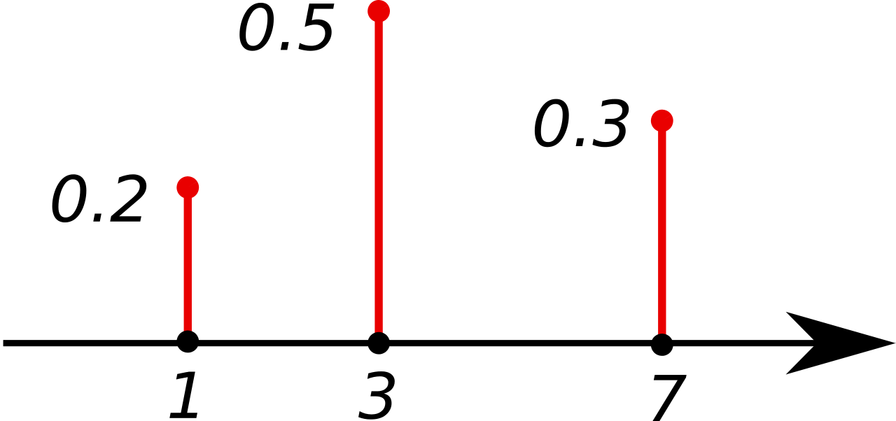 이산 (셀 수 있는) 사건에서 확률값을 계산할 경우, 이산 사건의 확률 분포를 표현하는 함수 중에 확률 질량 함수(=PMF=Probability Mass Function)를 사용합니다. 사건(x)에 대한 확률값(y)로 구성되어 있으며, y는 항상 0이상이고 Σ f(x)가 1인 함수 입니다.아래는 PMF의 예시입니다. (그림 출처 : link)
