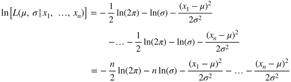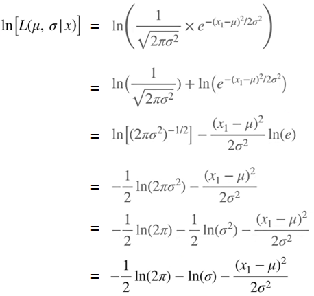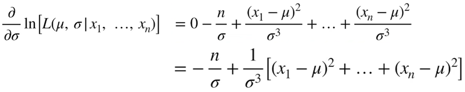 간단한 지수법칙, 로그 성질로 계산 될 수 있습니다. 이렇게 산출된 수식을 여러 개의 관측값이 있는 수식에 대입해보겠습니다. 즉 여러개의 관측값이 존재할 때, Likelihood(확률)값이 Maximum(최대) 될 수 있는 평균(μ)과 표준 편차(σ)를 계산해보겠습니다.