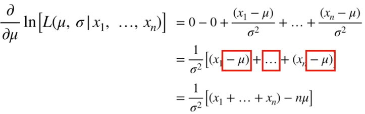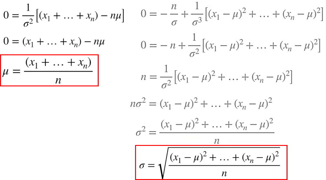 왼쪽은 μ에 대한 식이고 오른쪽은 σ에 대한 식입니다. 빨간색 박스가 최종적으로 찾으려고 한 'Likelihood를 Maximum(최대)해주는 확률분포 Parameter(μ, σ)'에 해당합니다. 수식을 이해하는데 막히는 부분이 있다면 link 를 참조 바랍니다.
