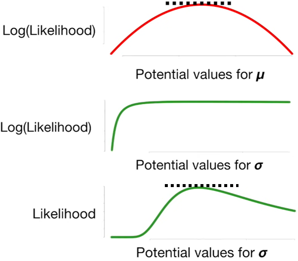 exponential distribution과 동일하게, gaussian distribution를 parameter를 미분하였을 때, 0이 되는 지점이 likelihood가 maximum이 됩니다. gaussian distribution은 변수가 2개(평균(μ)과 표준 편차(σ)) 있기 때문에, 각각에 대해서 편미분 해줍니다. 편미분 했을 때, 0이 되는 지점이 maximum이 될지 확인 해보기 위해서, 각각의 확률분포 parameter에 대해 그래프를 그려보겠습니다.