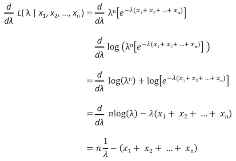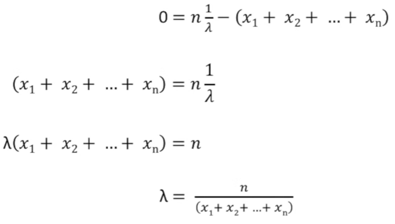 1번째 줄은 Likelihood를 미분했을 때 0으로 만들려고 했기 때문에, 넣어준 값입니다. 이를 전개하면, 최종적으로 구하고자 했던 'Likelihood를 Maximum(최대)해주는 확률분포 Parameter(λ)'가 마지막 줄과 같이 계산되어 집니다. 수식을 이해하는데 막히는 부분이 있다면 link 를 참조 바랍니다.