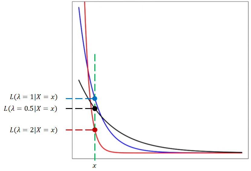 아래 그림은 위 수식에 대한 확률 밀도 함수(pdf)입니다. λ가 주어진 확률 분포의 parameter입니다. λ의 변화에 따라 관측값 x에 대해 확률값(=Likelihood)이 어떻게 변하는지를 아래 나타냈습니다.