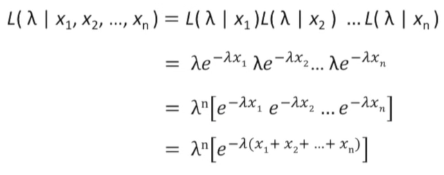 여러 개의 사건이 관측되었을 때, Likelihood(확률)값이 Maximum(최대)가 될 수 있는 λ를 계산해보겠습니다. 여러개 사건이 관측(x)되었을 때, 확률 분포 parameter(λ) 대한 Likelihood에 대한 수학적 정의는 아래 왼쪽 항과 같습니다. 그리고 풀면 4번째 항과 같이 됩니다.