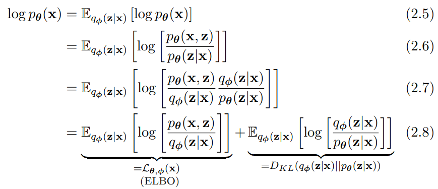 q(z|x)는 계산이 가능하지만, p(z|x)는 계산이 불가능합니다. KL Divergence 값은 항상 0 이상의 양수를 만족하는 성질을 이용하여, (2.8)의 왼쪽식이 Evidence Lower Bound (ELBO)가 되어 ELBO를 최대화는 문제를 풀 수 있습니다. 아래에 다른 기호로 정리된 수식을 보면, (2.8)의 우측식이 사라지고, 좌측식과 유사한 형태가 남은 것을 볼 수 있습니다.