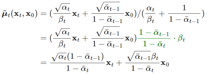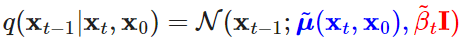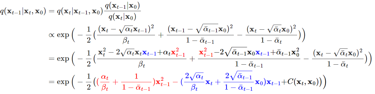 네 번째 줄을 해석하자면, C(xt,x0)는 x-1과 관련성이 없기 때문에 상수 처리되고, Gaussian Distribution의 pdf 위 수식에 의해 빨간색과 파란색 부분이 각각 표준편차(σ), 평균(μ)이 됩니다.