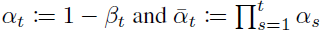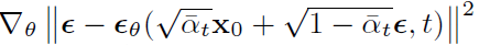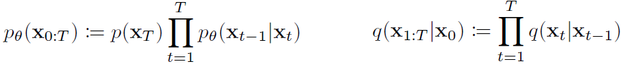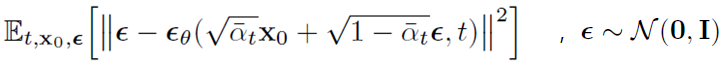 x0는 확률분포 q의 입력으로 주어집니다. t는 정수 T까지 정수값을 가집니다. ϵ는 가우시안 분포(=정규 분포)를 따릅니다. 아래 수식을 Neural Network의 weight를 update하기 위한 Loss로 사용합니다.