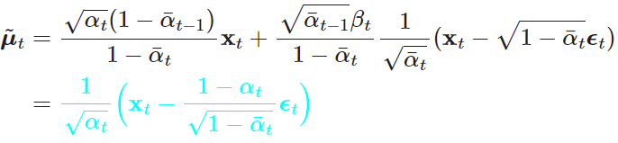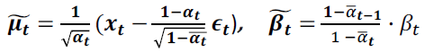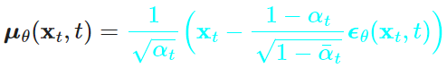 로 정의하고 평균이 어떻게 정의되는지 보겠습니다. pθ는 q의 평균을 근사화하고자 합니다. q의 평균 식에서 xt는 입력값이고, α, α헷은 고정값입니다. 가우시안 분포(ϵ)를 따르는 네트워크를 시간 t에 따라 학습 시키기 위해서, 평균을 아래와 같이 정의해줍니다. 위 q( xt-1 | xt, x0 ) 의 식에서 변경된 부분은 ϵ입니다.